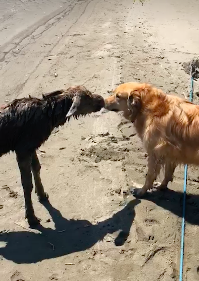 Looking more wet dog than wild animal, the little calf even touched noses with the group’s golden retriever.