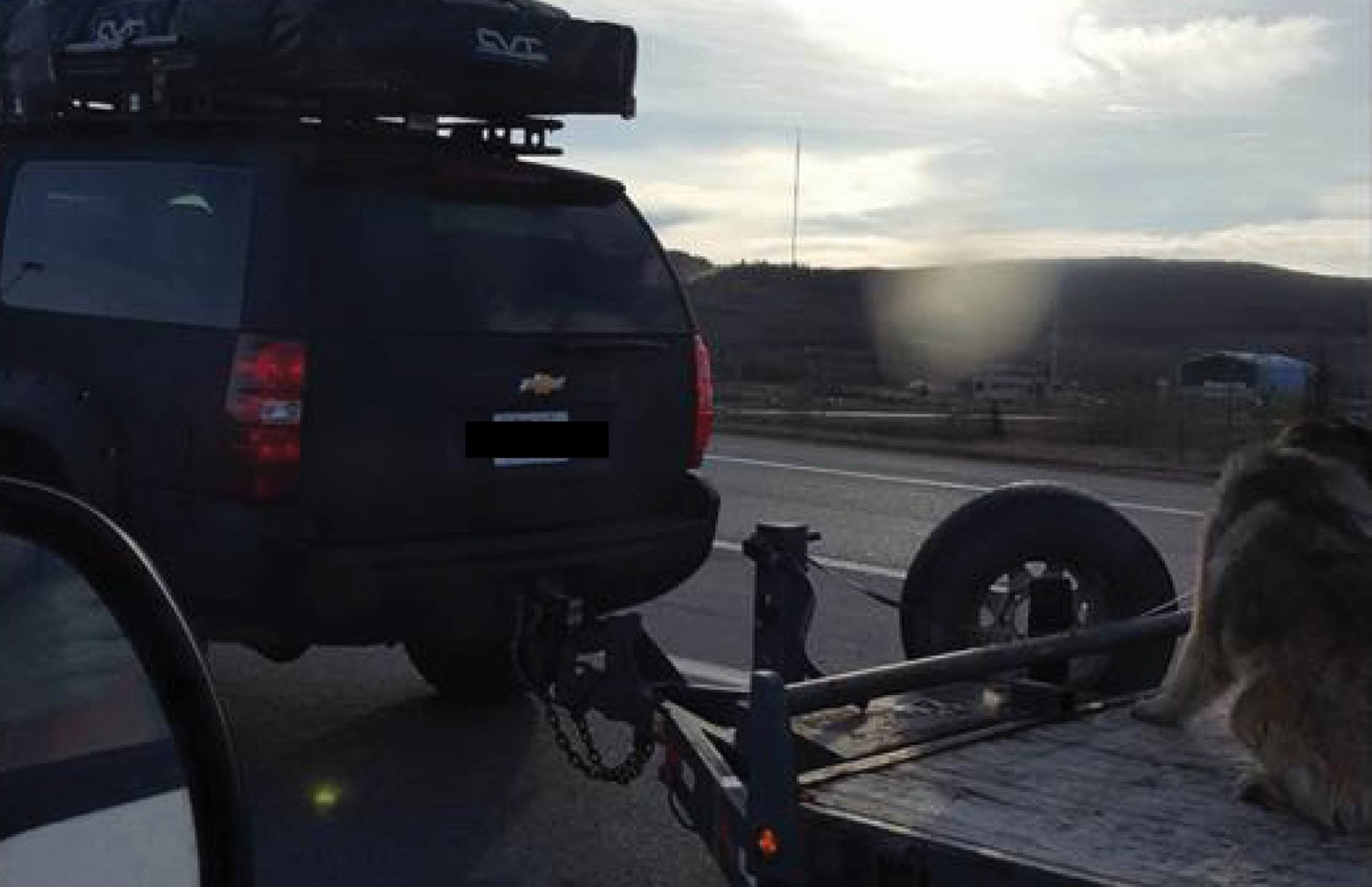Ryan Harris snapped this image of a dog tied helplessly on a flatbed trailer driving along a Calgary highway. He posted it on Facebook.