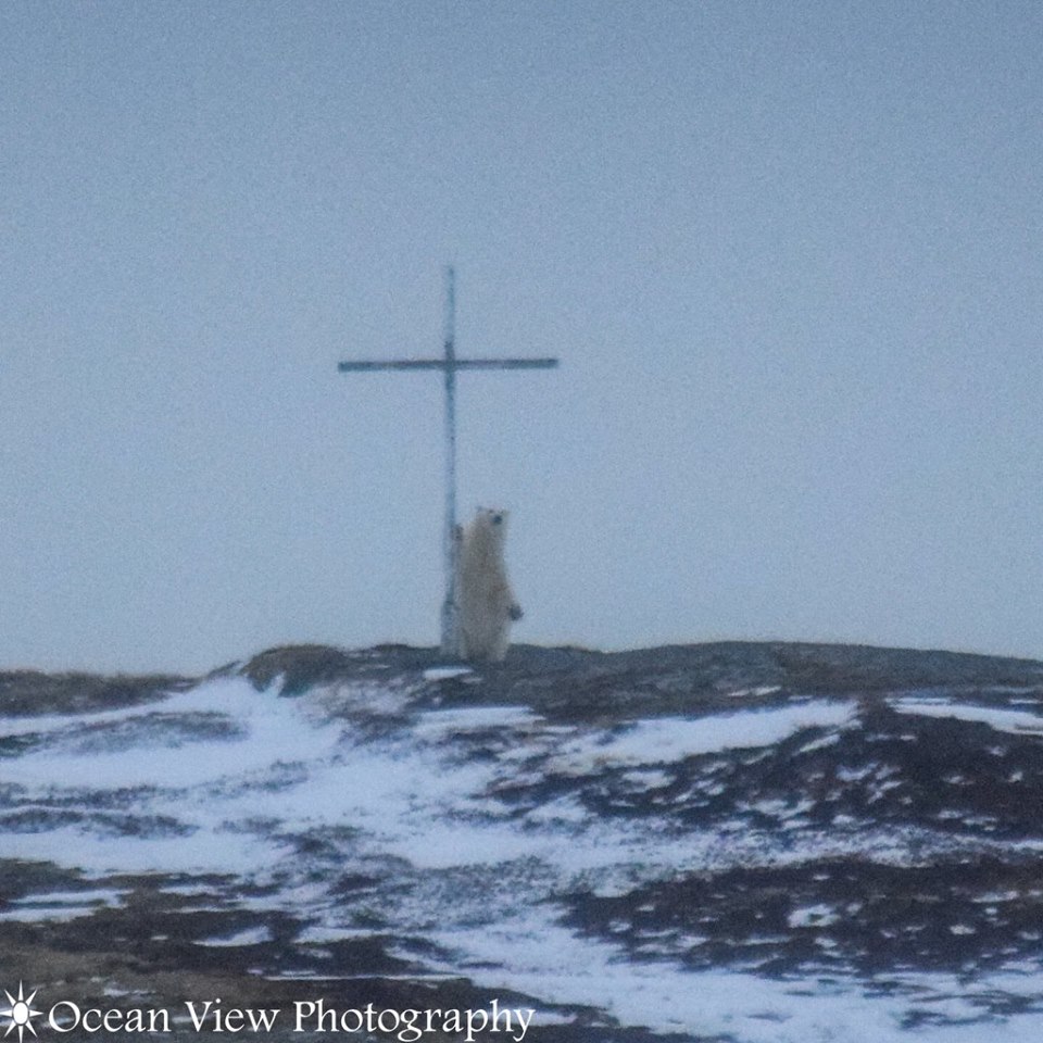 Meanwhile, on the other side of the continent, in Newfoundland and Labrador, nother photographer recently snapped what appears to be a polar bear in mid-prayer beneath a cross.