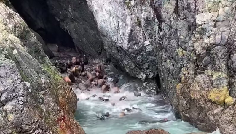 Dozens, perhaps more than 50 sea lions, soon bounded out of a cave and set off on a stampede towards the ocean.
