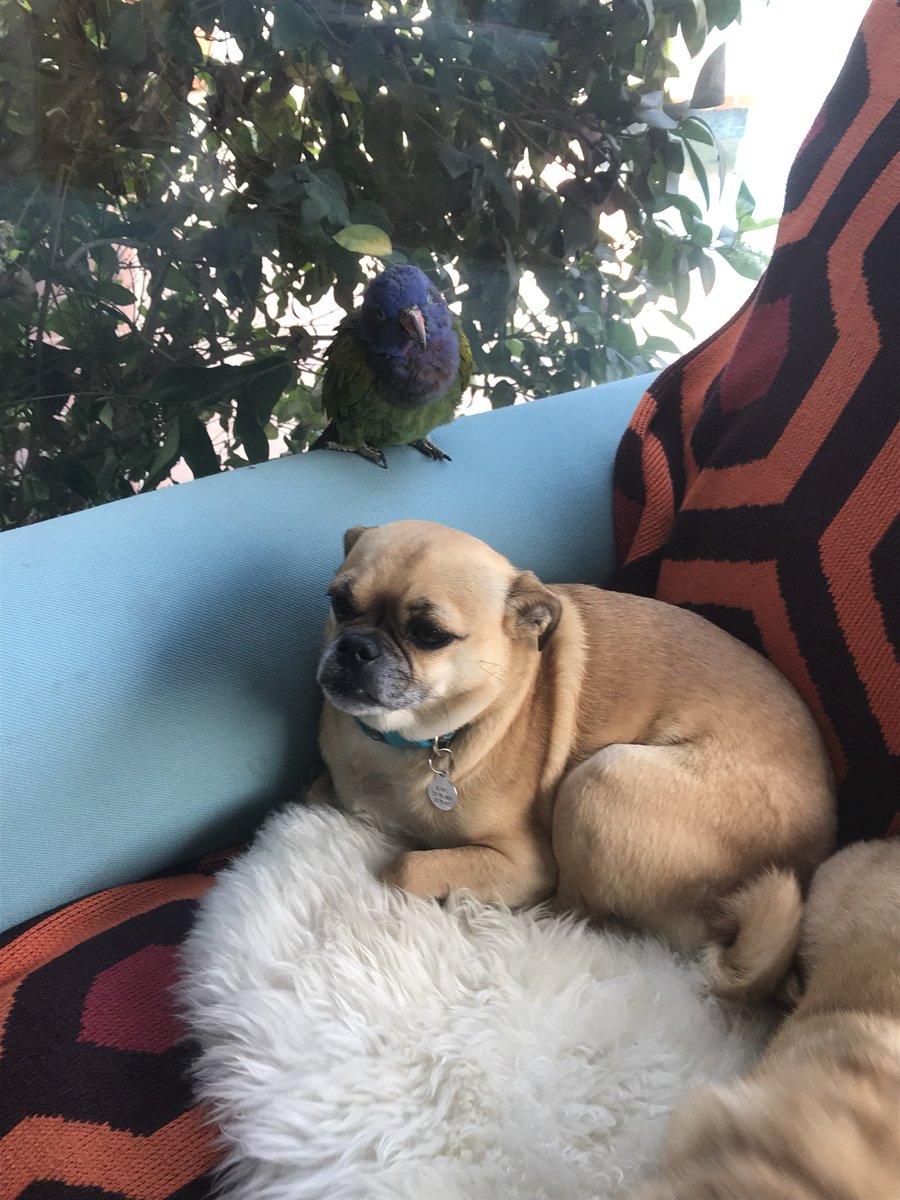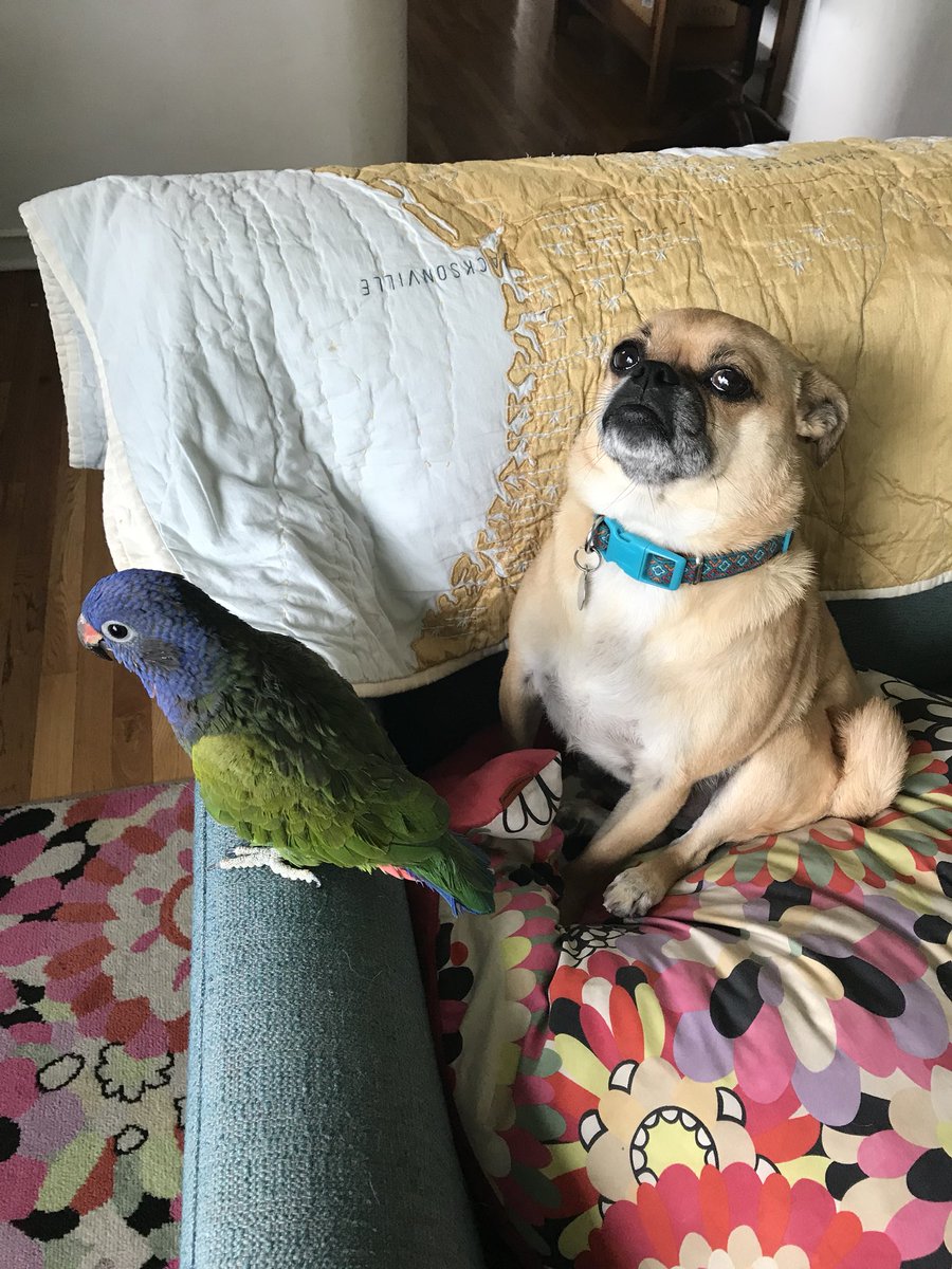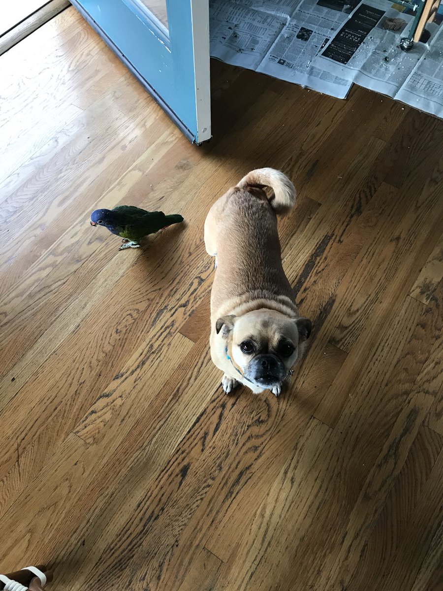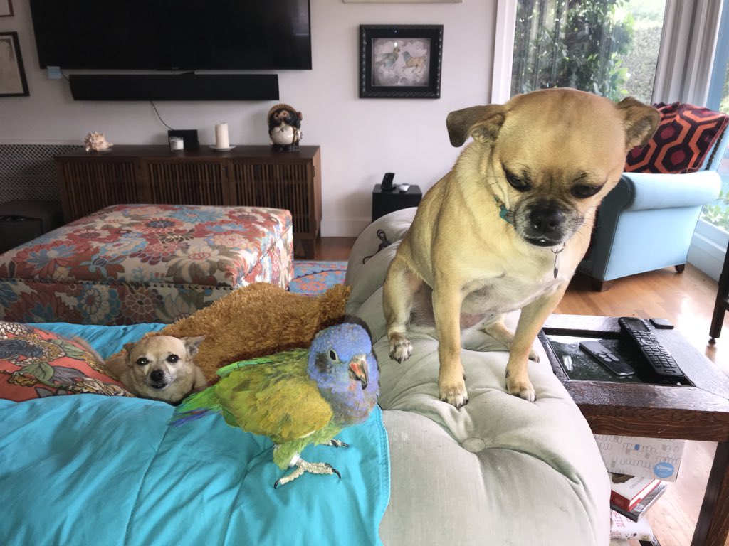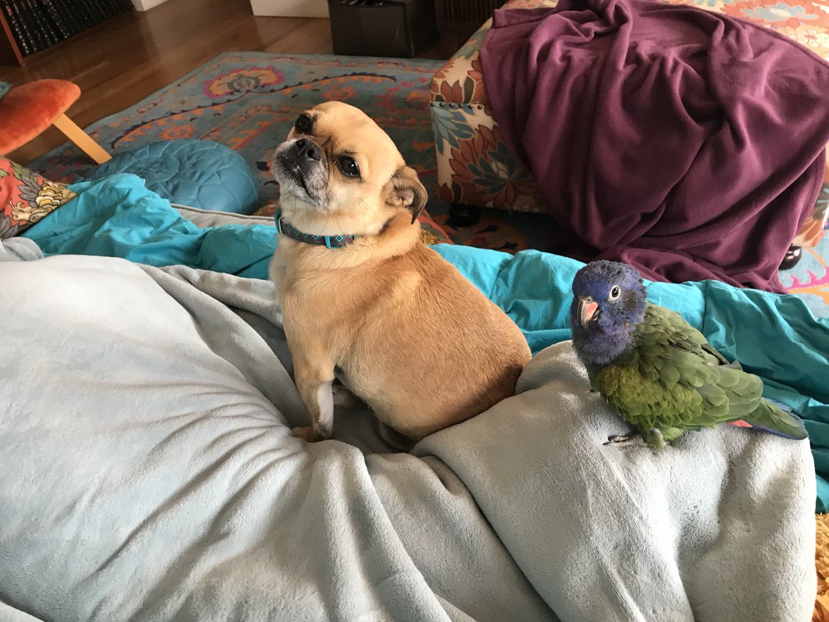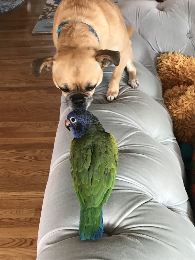 We’ve had our parrot, Nacho, for about 10 yrs now, and every Spring he has about a 2 wk mating urge. It’s super annoying. In previous yrs, I have been the object of his procreation obsession, but this yr he has decided our dog Kiwi is his new mate. pic.twitter.com/Jlh7S2StGy