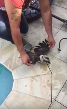 “My dad was in his car when he saw the bird hit the glass wall in land in our pool in which he drowned and was close to dying. My dad staright away got the bird and formed cpr on him/her. The cpr was working okay but he needed something more strng so he brought something else into the scene. This thing pumped large amounts of air very fast. My father placed the tube in the birds mouth and turned it on which straight away brought him back to life!”