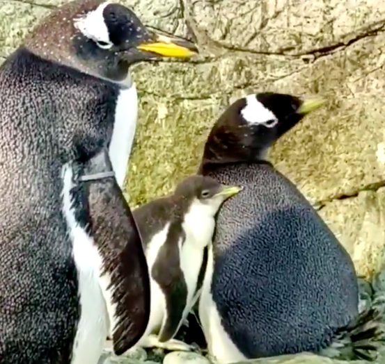 “Gentoo penguins co-parent their young, and just as a female-male pair would do, the two fathers have taken turns tending the nest, incubating the egg and now feeding the chick,” the zoo added.