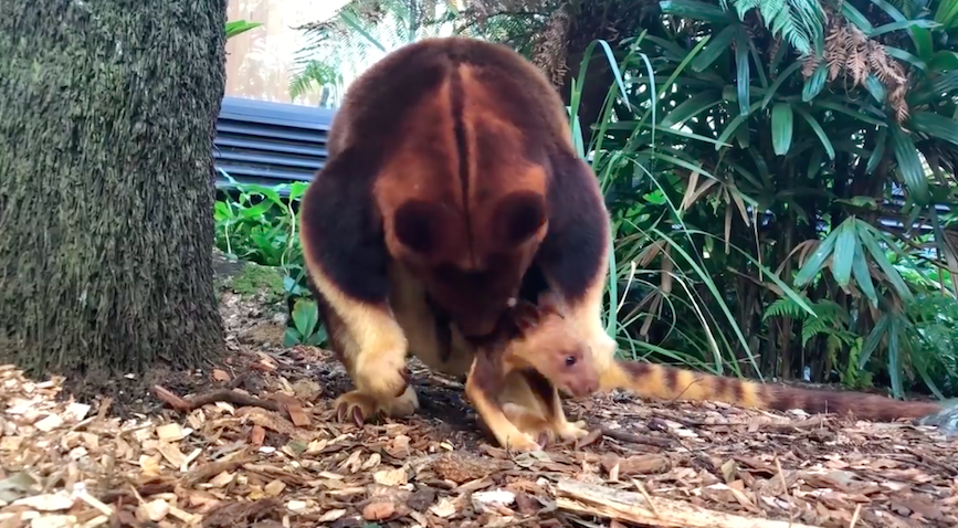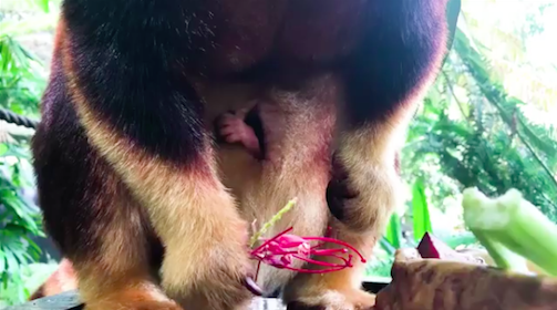 Almost as quickly as he exited his mother’s pouch, the Goodfellow’s Tree Kangaroo hopped back in.