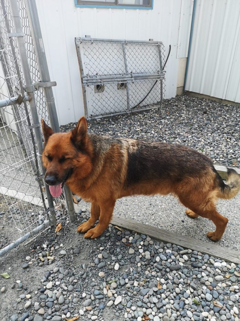 The German shepherd that was strapped in a crate to the back of an RV during a blistering British Columbia heat wave is now being held by animal protection officers.