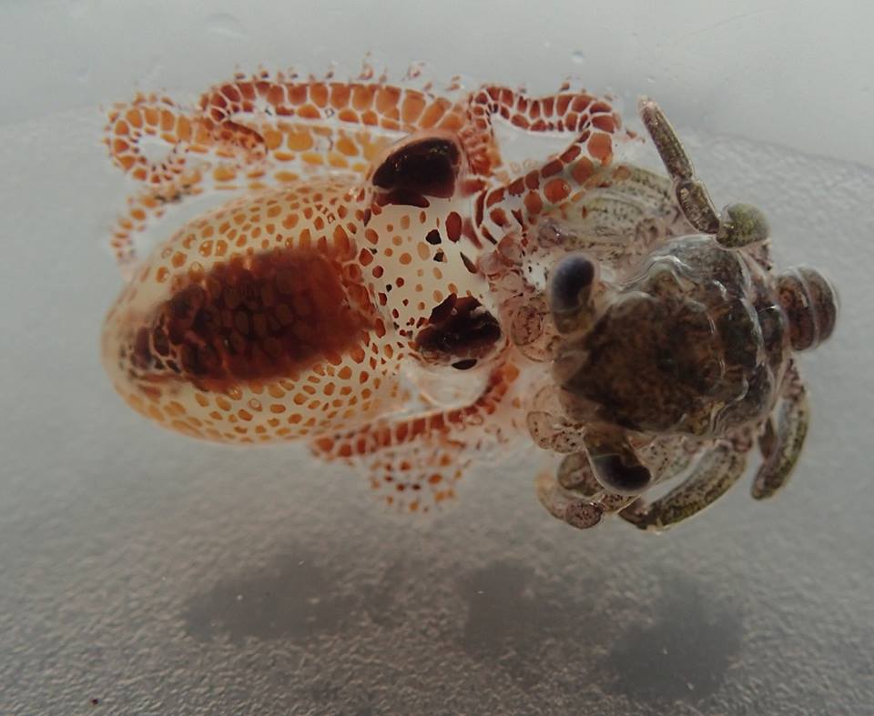 Here’s a photo of another baby octopus taken by the dive team (again found on plastic debris) attacking and killing a baby crab.