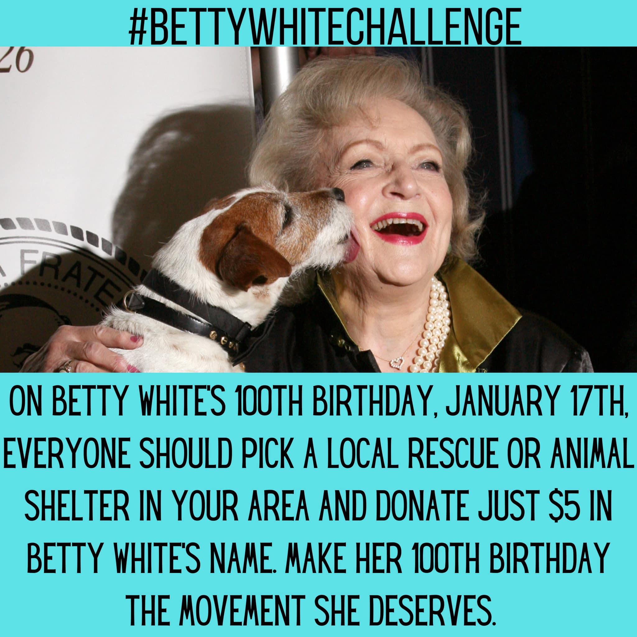 “On Betty White’s 100th birthday, January 17th, everyone should pick a local rescue or animal shelter in your area and donate just $5 in Betty White’s name. Make her 100th birthday the movement she deserves.”