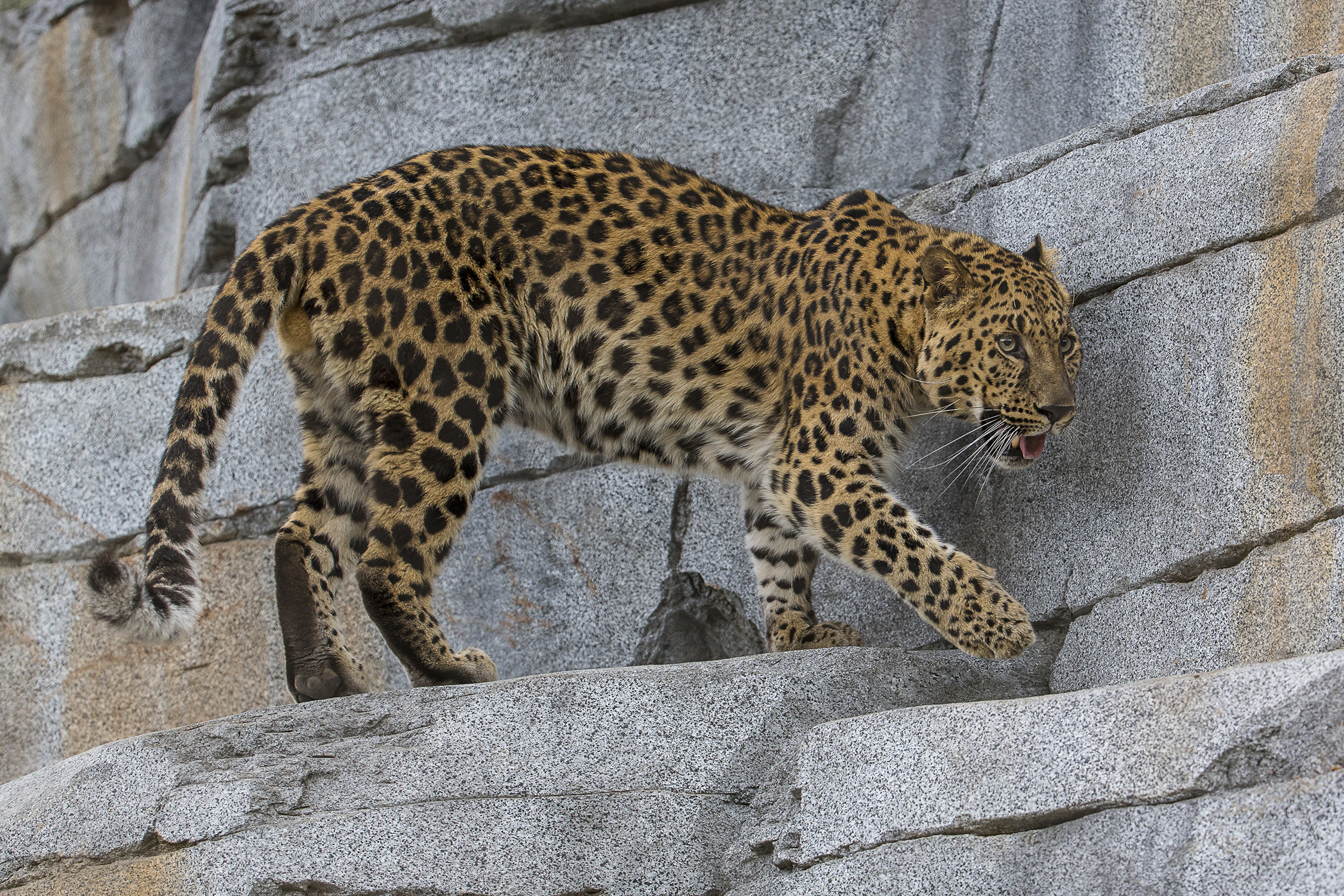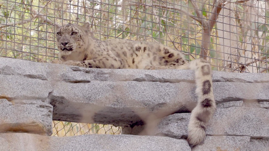 Two Amur leopards, including the four-year-old male cat that you can see climbing on rocks in the photo above, and one snow leopard, are settling into the 16,500-square-foot space, which features trees, slopes and, well, cat walks.