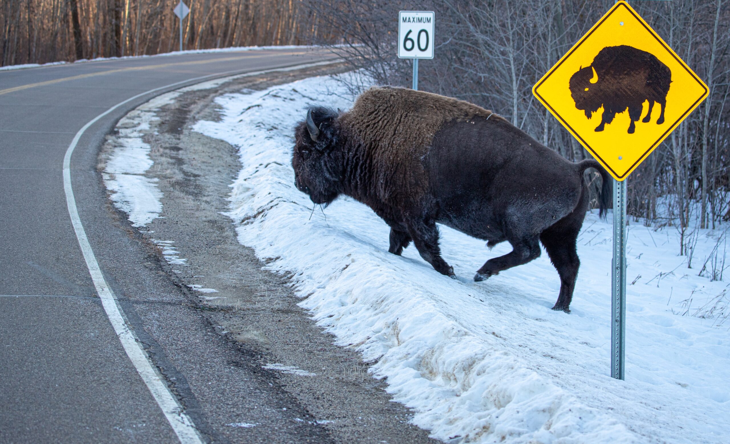 Take for example this bison photographed while crossing the road at a bison crossing sign in Alberta.