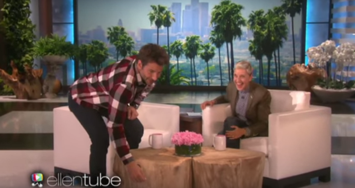 When Ellen asked whether Bradley had ever fed the squirrels as Clint does, that’s when Bradley got up to do his impression of how the big man feeds the squirrels that come right to his office.