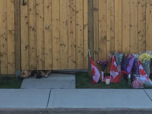 Today, mourners delivered flowers and messages to Hamilton’s downtown armoury and to the Cirillo family home where a particularly somber site was the reservist’s dogs peeking out from under the fence.