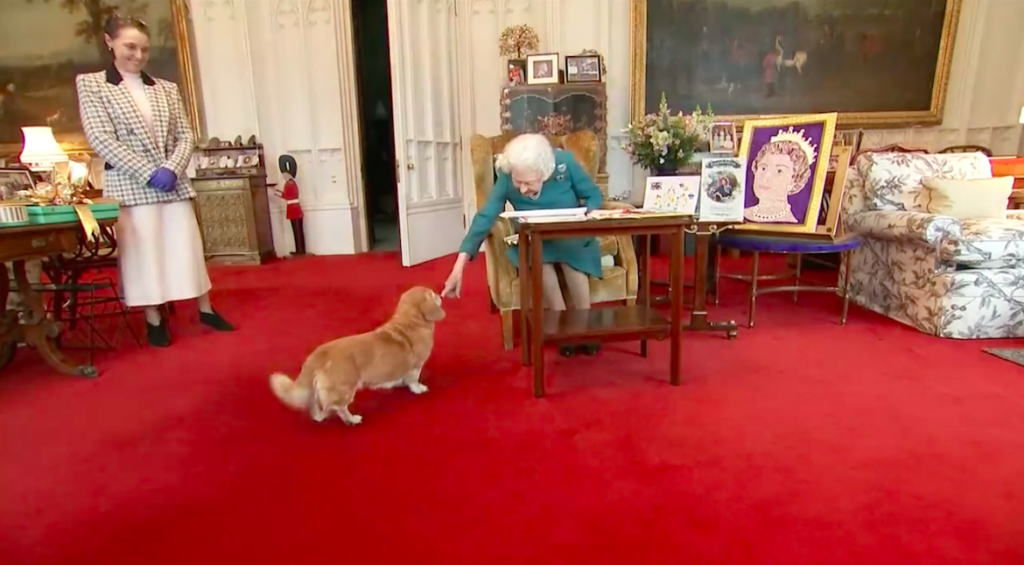 As the Queen perused a selection of cards, recipes and mementoes from children and others around the world, her beloved dorgi, a cross between a corgi and a dachshund, photobombed the moment by walking through the Oak Room at Windsor Castle.