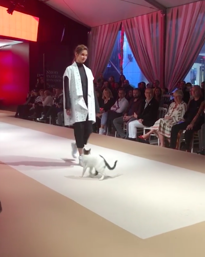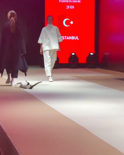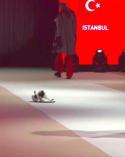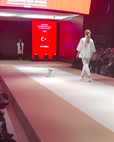 A stray sauntered the runway of fashion school graduates in Turkey recently as the models walked by rather unfazed by the uninvited guest.