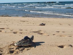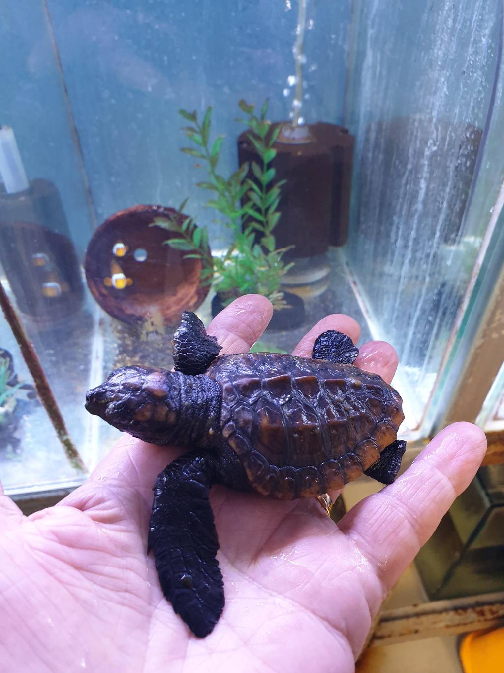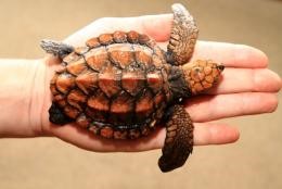 A chunk had been taken out of its shell and two flippers were missing — the little turtle got away before it was eaten.