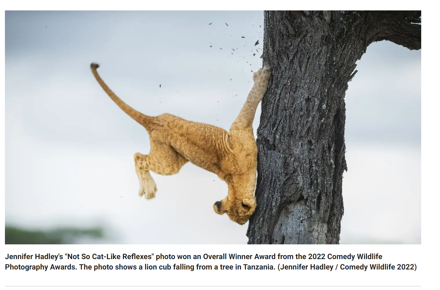This year’s winner is titled Not so cat-like reflexes by photographer Jennifer Hadley who caught the moment when a cub tumbled down a tree.