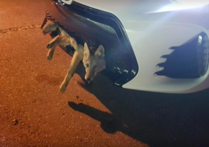Knox heard the crunch and knew right away that she had struck a coyote. Because of the impact and the sound, Knox thought she ran over and killed the critter.