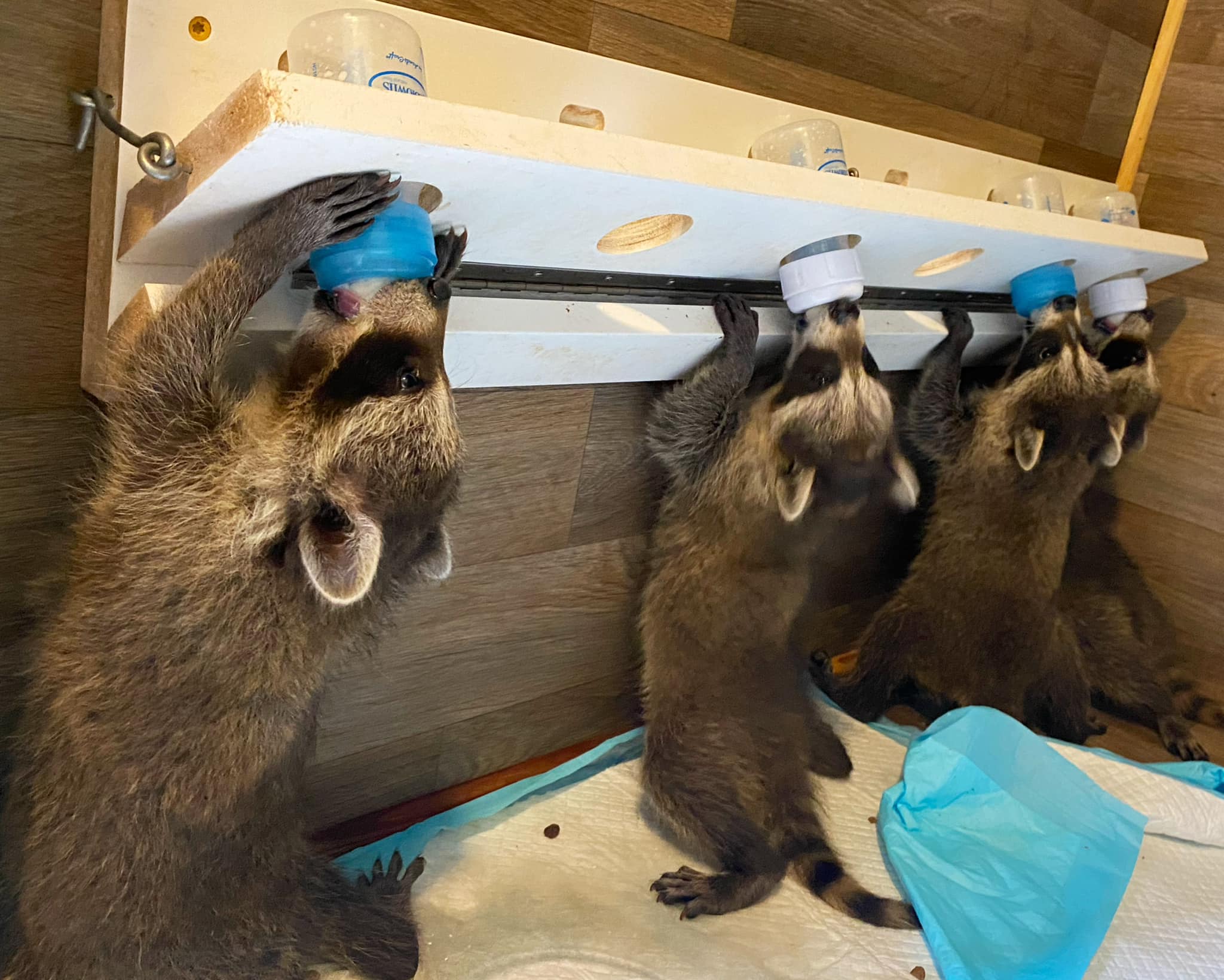The Chelmsford, MA organization posted the cutest photo over the weekend of four small raccoons drinking from bottles affixed to a table on a tilt.