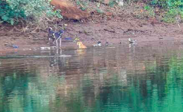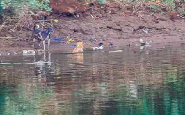 Feral dogs push a dog into the river. Photo: Utkarsha Chavan