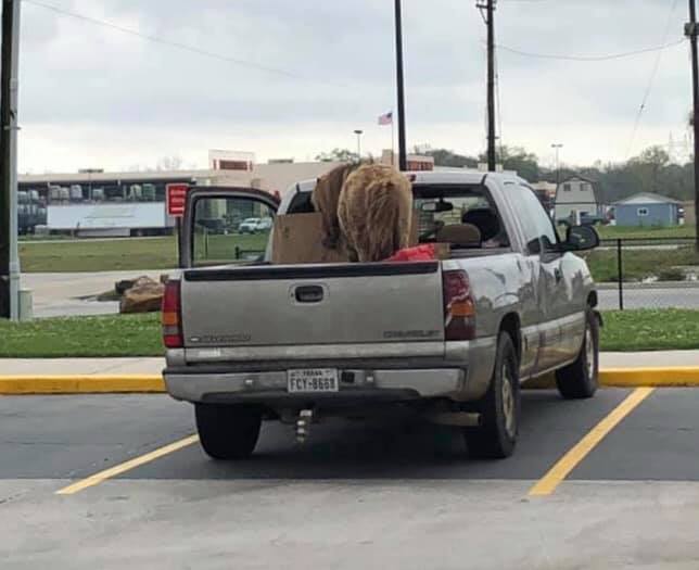 Kerry Green Costello was driving on Highway 59 past Lufkin, Texas when she saw a fully-saddled horse standing int he bed of a pickup truck going about 70 miles per hour.
