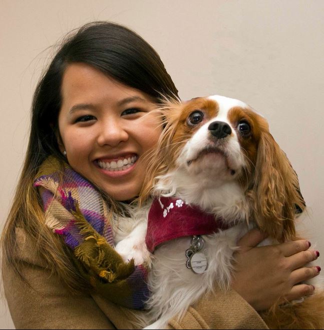 The dog jumped up and grabbed her microphone as she was talking about the spring weather in Moscow.