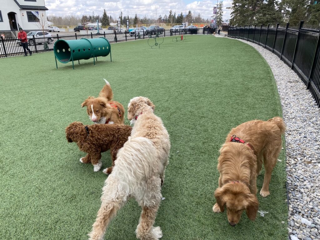 Dogs enjoy a dog park.