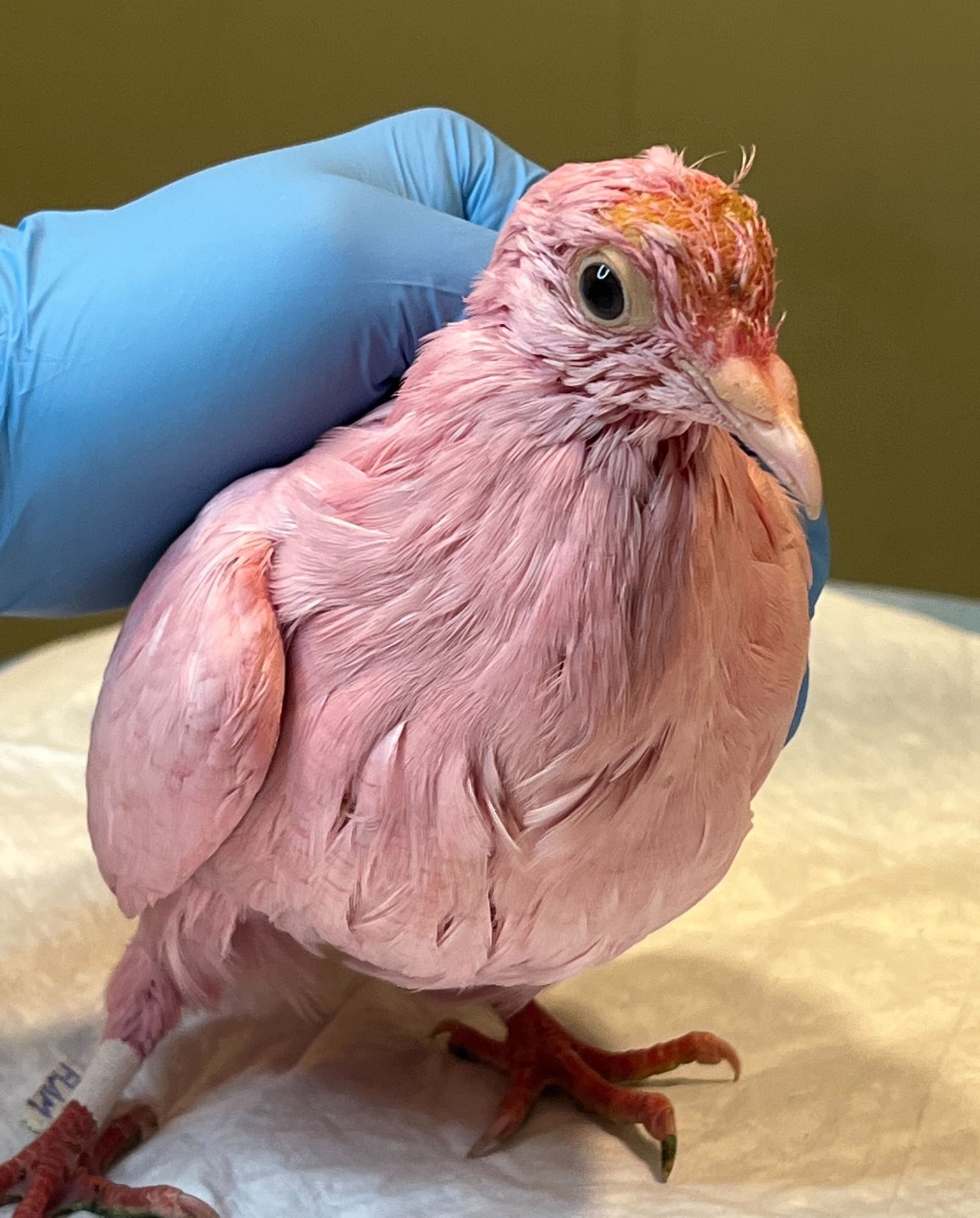 Someone completely submerged a domestic king pigeon in pink dye and released it in New York City where it surely would have died if not for a good Samaritan, according to the group now caring for the bird.