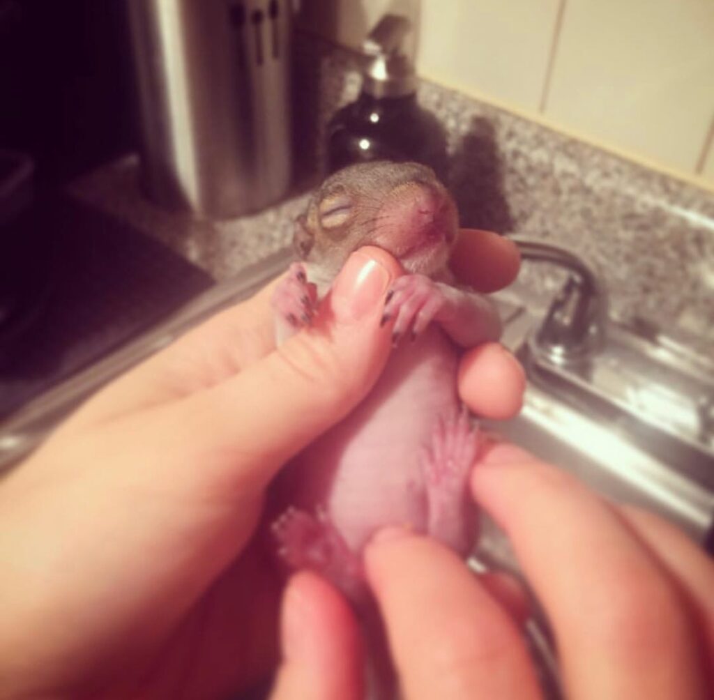 Thumbelina is an Eastern Grey Squirrel rescued back in March, 2016 after her nest was destroyed amid construction in the Bronx. Her sister died not long after. Attempts to reunite the tiny baby with her mother would later fail.