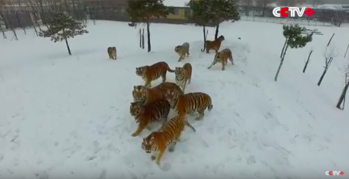 “Video footage of a habitat for these rare felines in northeast China’s Heilongjiang Province shows them meandering about until they catch sight of a drone with a camera buzzing around,” notes China Central Television, which posted the video. “The rather chubby tigers played cat and mouse with the drone until a 2 or 3-year-old tiger swiped at the camera, a large paw filling its screen before losing signal.”