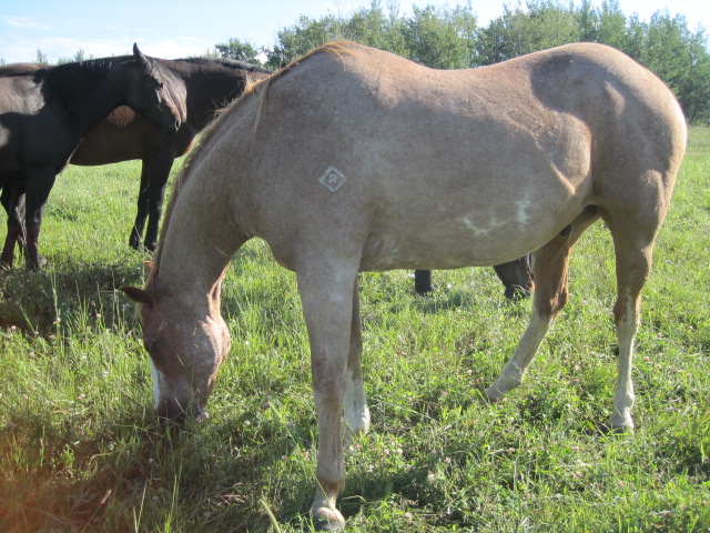 Willard: Born in 2001, the read roan quarter horse gelding is 16hh, has brand on front left shoulder, a wide white blaze on his face as well as 3 white stockings on front right and both back legs.