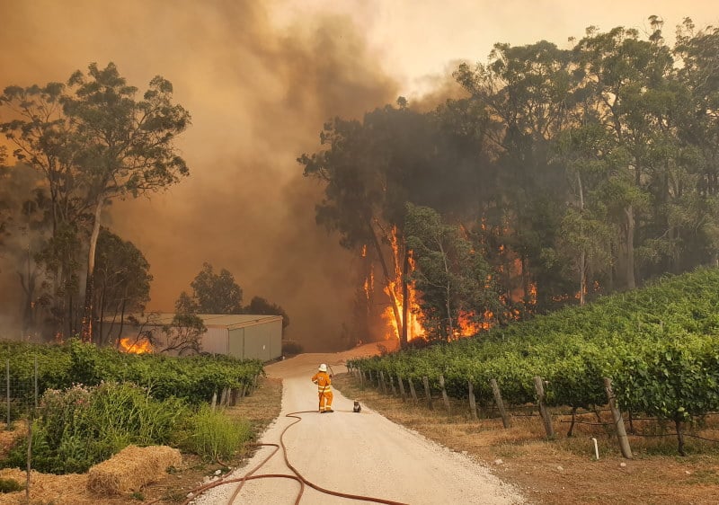 As South Australia burns in catastrophic bushfires, a firefighter and a koala stop to watch the Cudlee Creek fire.
