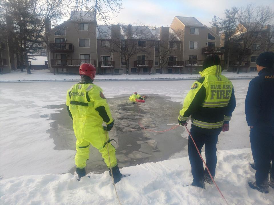 Check out our colleagues at @blueashfiredept rescuing this pup who fell through ice this morning! Way to go!!! pic.twitter.com/aufRPvXfZ1