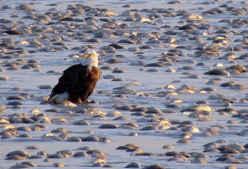 The fish died and floated to the surface. When the weather turned even colder, the ice expanded pushing it toward the shore where it buckled and went vertical. or it may have been driven there by very strong winds. The thousands of frozen fish on the lake attracted hundreds of bald eagles, various gulls and American crows as they fed on the dead fish. It was quite a sight and it smelled very fishy out there for quite awhile.”