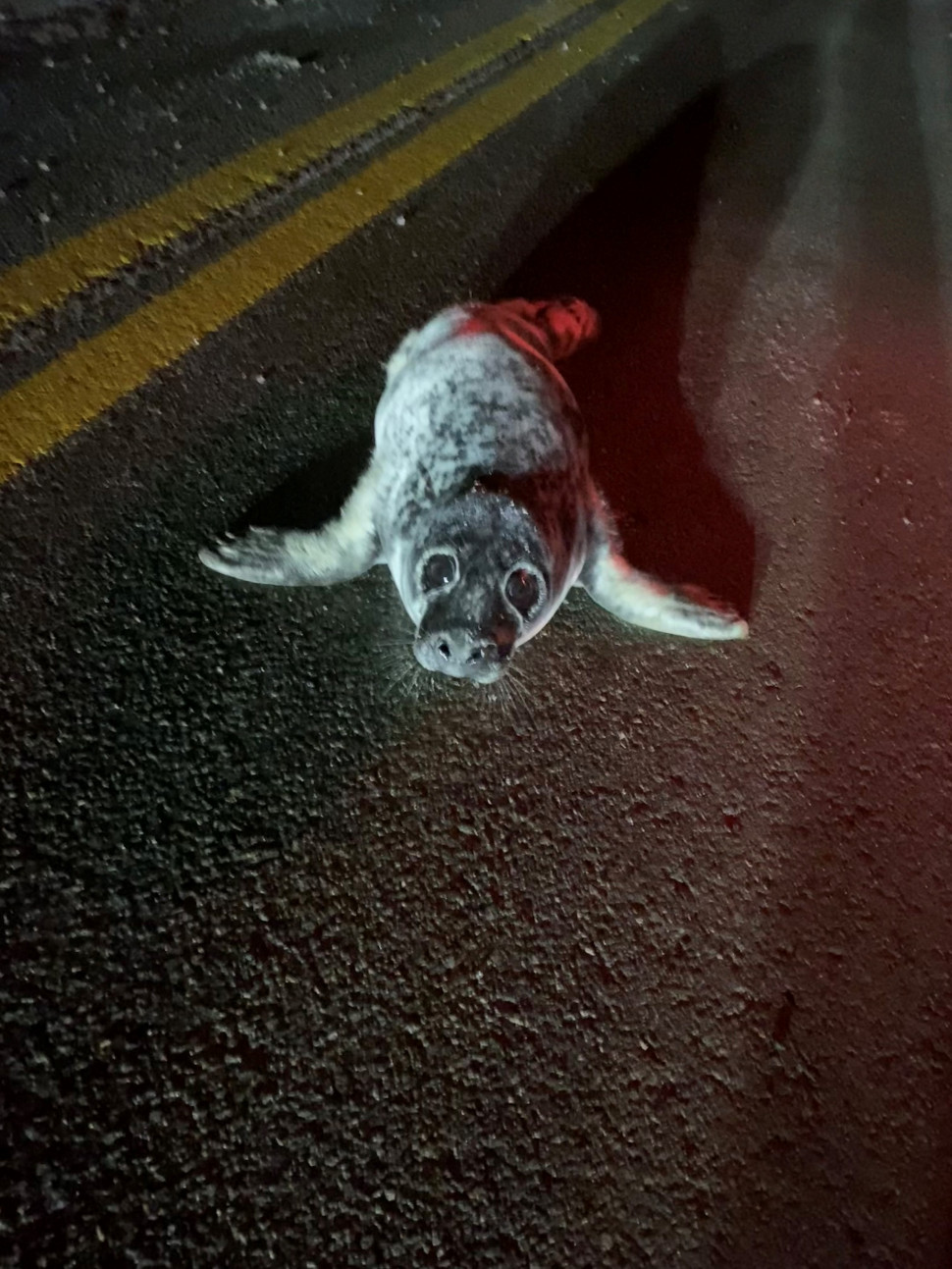 Officers found the baby seal halfway across the road. It was “agitated and uncooperative,” police said but eventually they got it to some safer scenery.