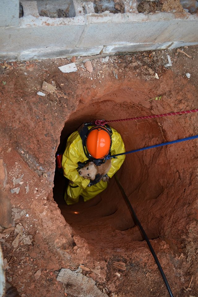 When the firefighters arrived on the scene, they found the two to three month dog in a 75 foot deep well.