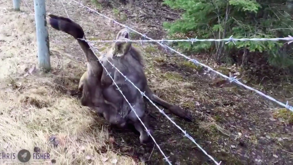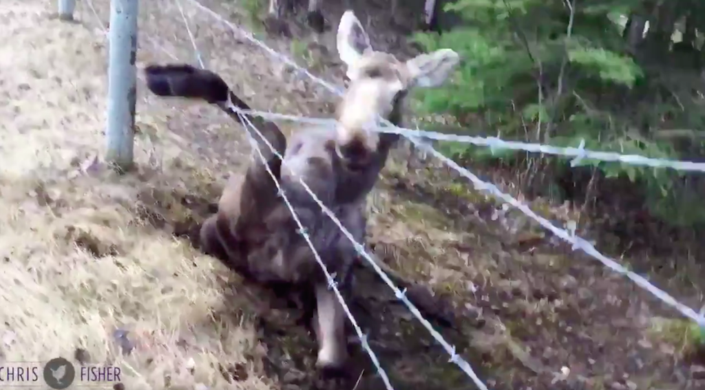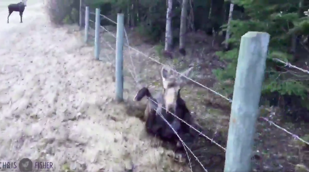The wildlife biologist was travelling through central Alberta, near Rimbey, when he spotted a distressed-looking mother moose along the side of the road. That’s when he also saw a calf tangled nearby in a barbed wire fence.