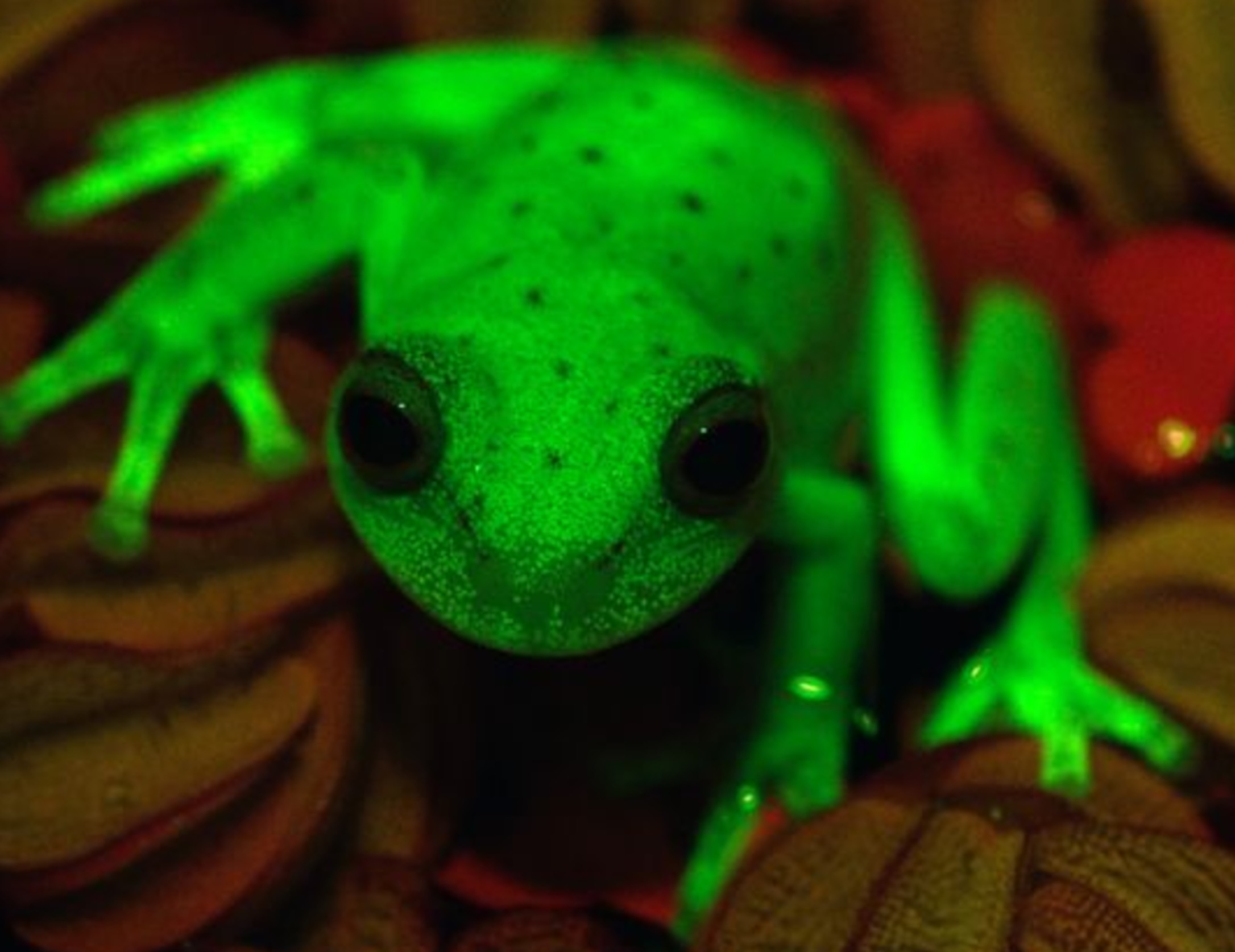 But shine a UV light on the frog and it turns a fluorescent celestial green.
