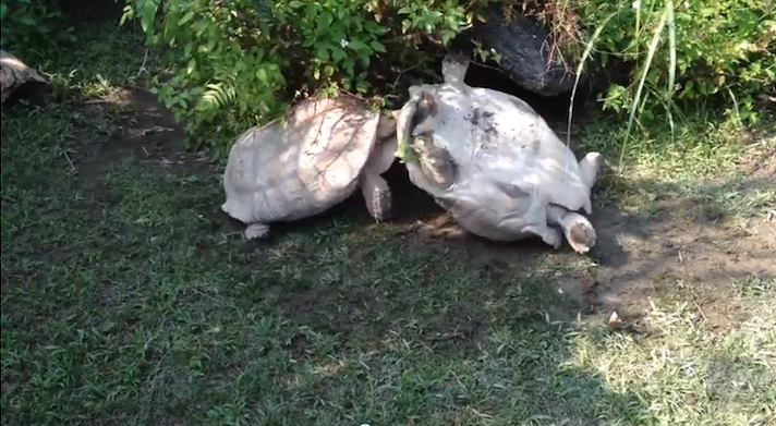 As troubled tortoise is flipped over, children can be heard cheering and applauding.