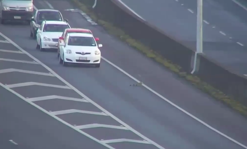 Watch as an Auckland traffic camera captures vehicles stopping along a busy highway to let a mother duck and her ducklings cross the road.
