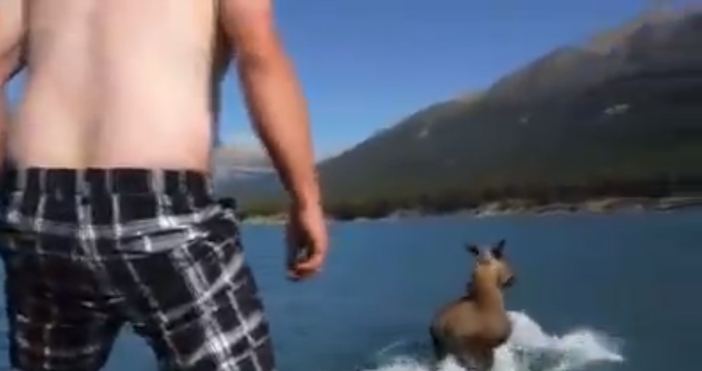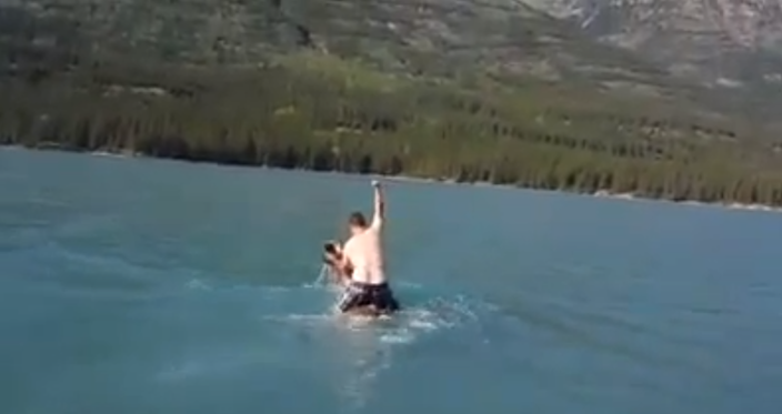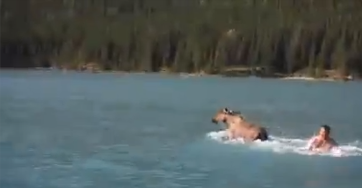 The video, which was posted to YouTube on Saturday, shows a group of men in a motorboat chase a moose through a water body in a mountain range. A shirtless man stands at the front of the boat as the animal wades through the water.