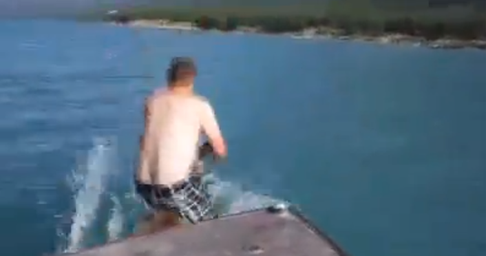 When the boat gets close enough, the shirtless man leaps onto the back of the animal.