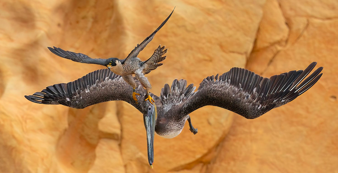 “For four years, I attempted to capture the rare sight of the female falcon attacking large brown pelicans with incredible speed and agility,” the United States-based photographer in a statement when the awards were announced this month. “I love the eyes of the pelican in this image, surprised and scared. The action was fast, and over in the blink of an eye. But I’ll remember that moment forever.”