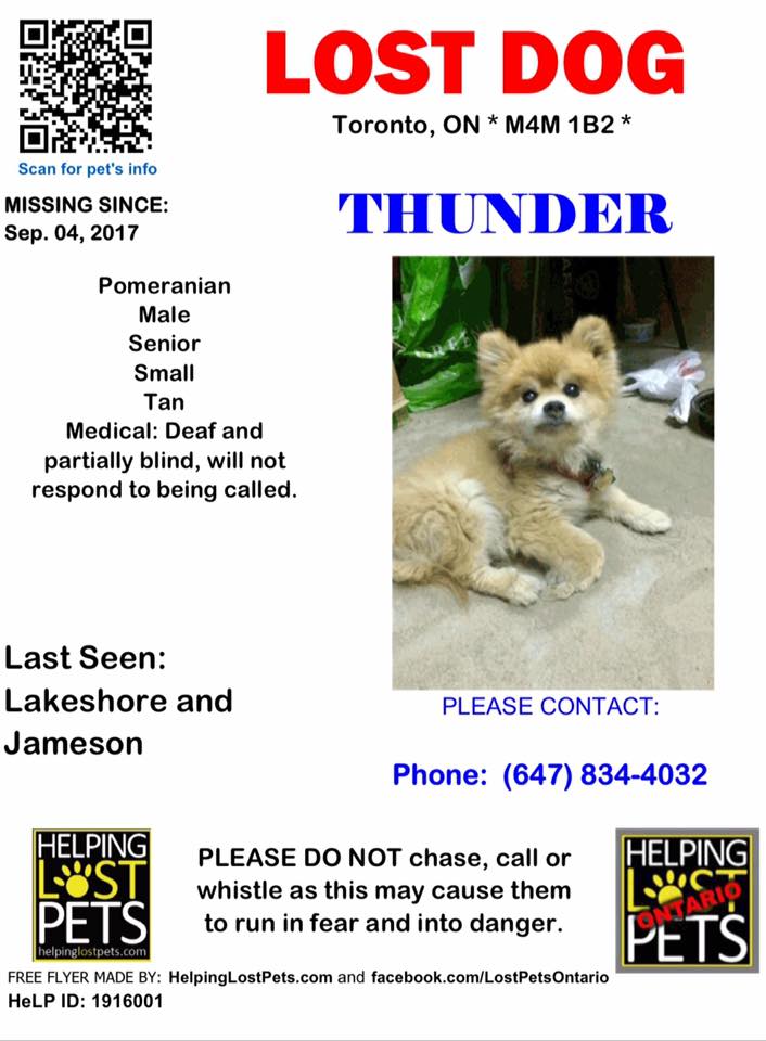 “Thunder- 16 year old pomeranian missing at Marilyn Bell Park by Lakeshore and Jameson,” Kyle wrote. “Deaf, so will not respond to his name being called.”