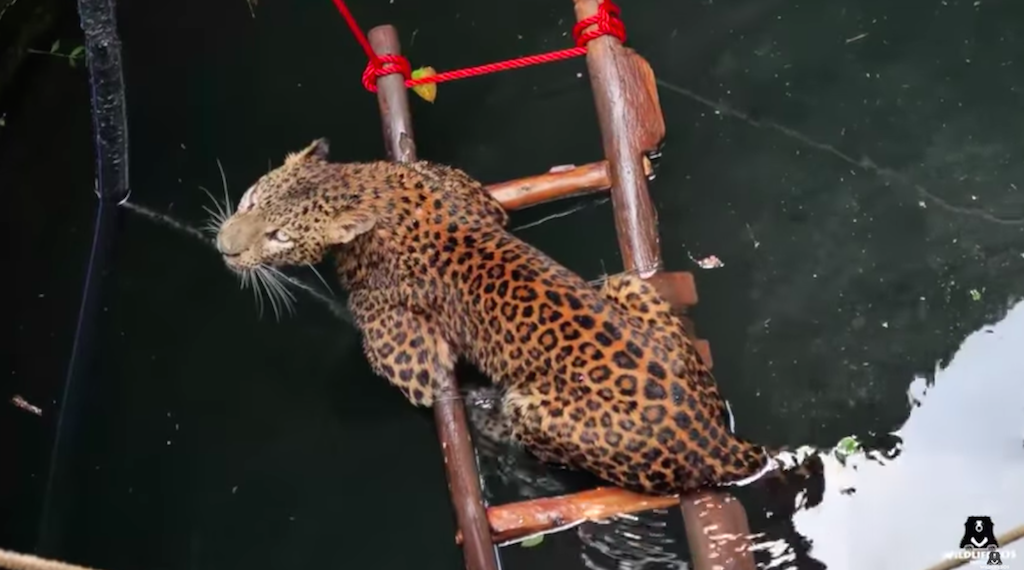 The leopard was saved using a ladder, ropes and a crate. Wildlife S.O.S./YouTube