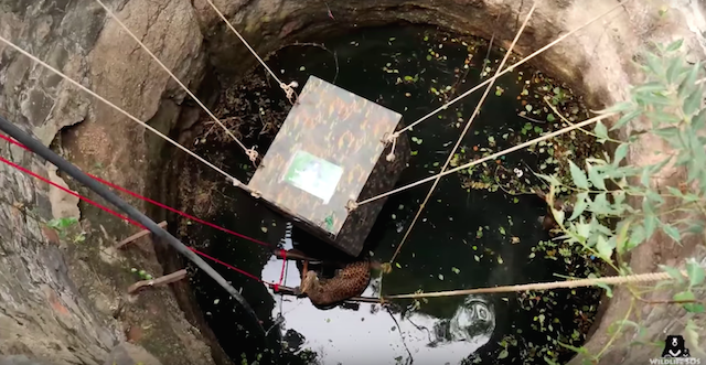 The rescuers first dropped a ladder down the 30-foot well to give the leopard something to rest on and get a break from the water. Then, they used ropes to lower a crate down to the helpless animal.