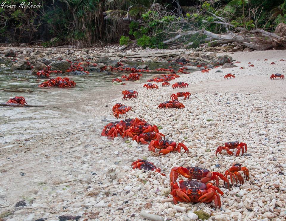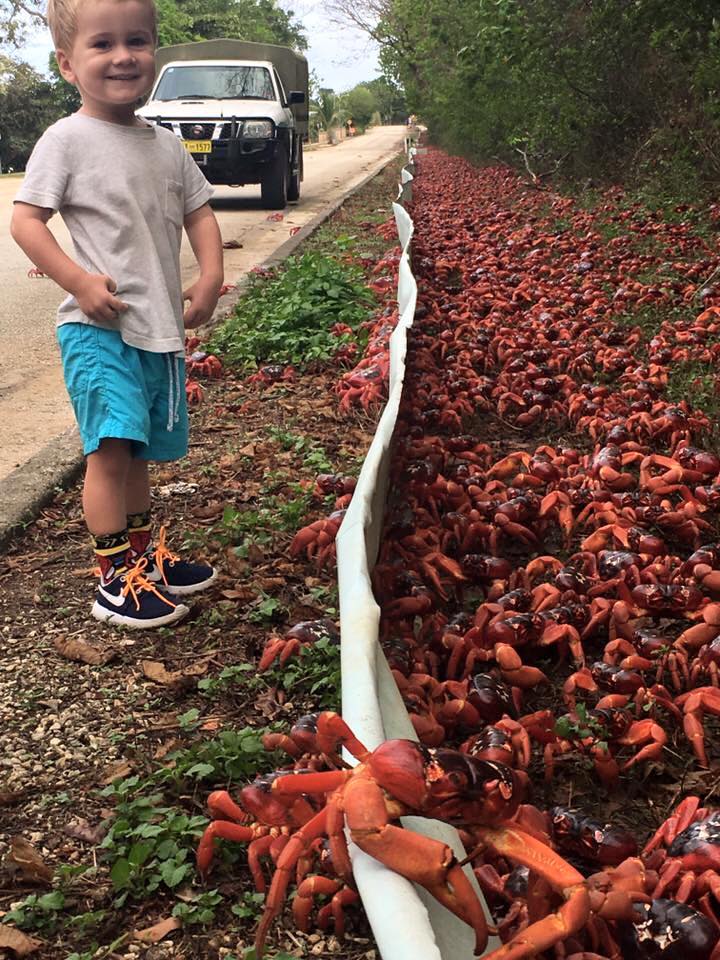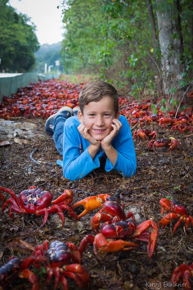 “So, this is me…enjoying the afternoon with some very busy crabs! Its migration time & our red crabs have started making their way across the island on their annual migration. Come with me over the next few weeks as I follow the crabs on their journey to the sea!! “