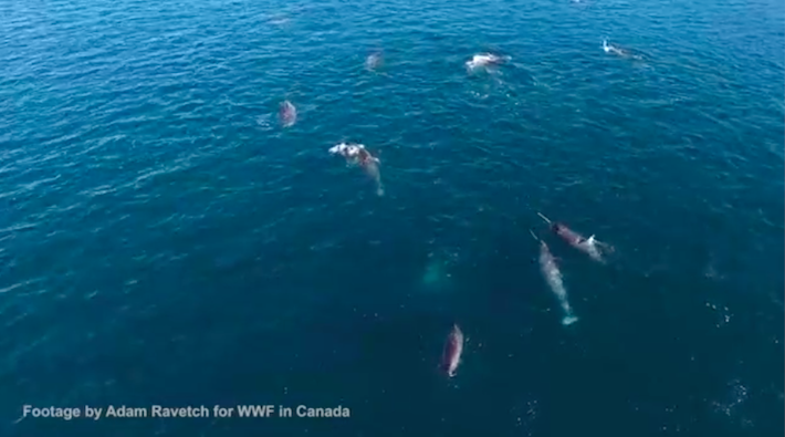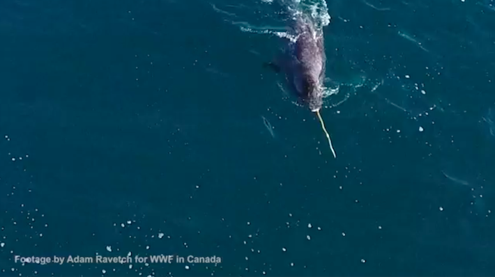 “Narwhals have a long tusk, which is actually a canine tooth that spirals counterclockwise up to nine feet forward from the head of adult males, and a small percentage of females,” WWF Canada said in its YouTube videos. “In this footage, a narwhal can be seen using quick taps of its tusk to stun Arctic cod, rendering them immobile and thus easier to capture and eat.”