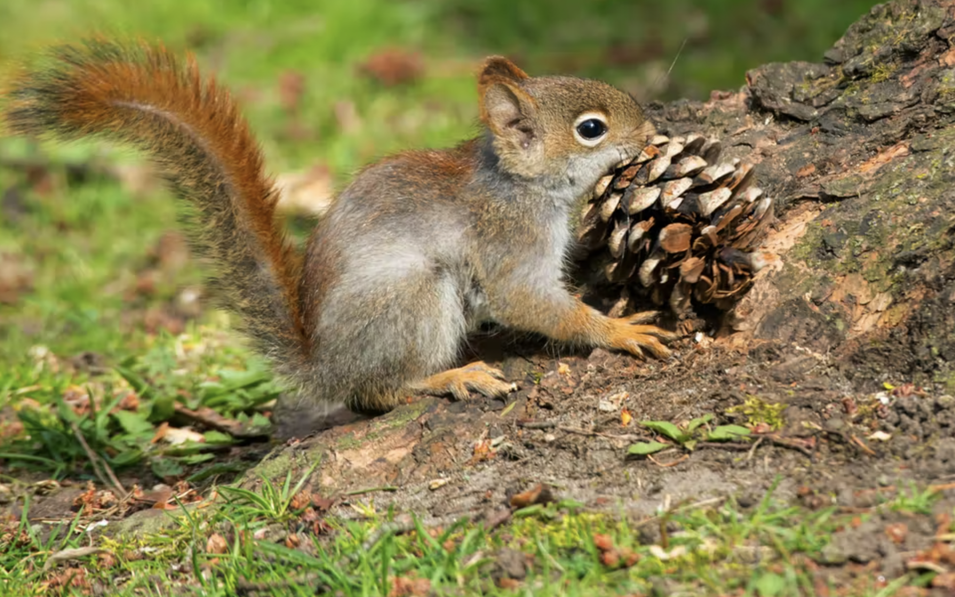 North American red squirrels spend most of their days in a 50-100 metre territory foraging for pine cones and other food sources like berries and mushrooms.