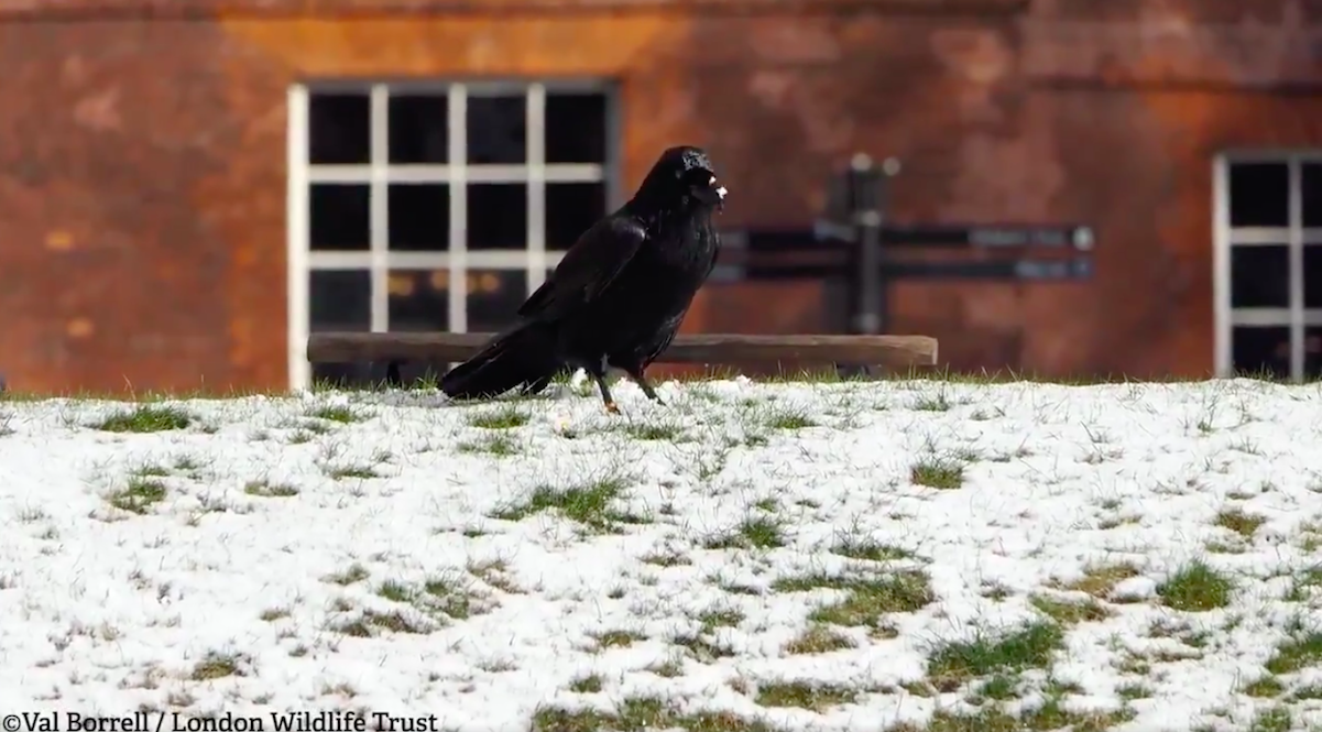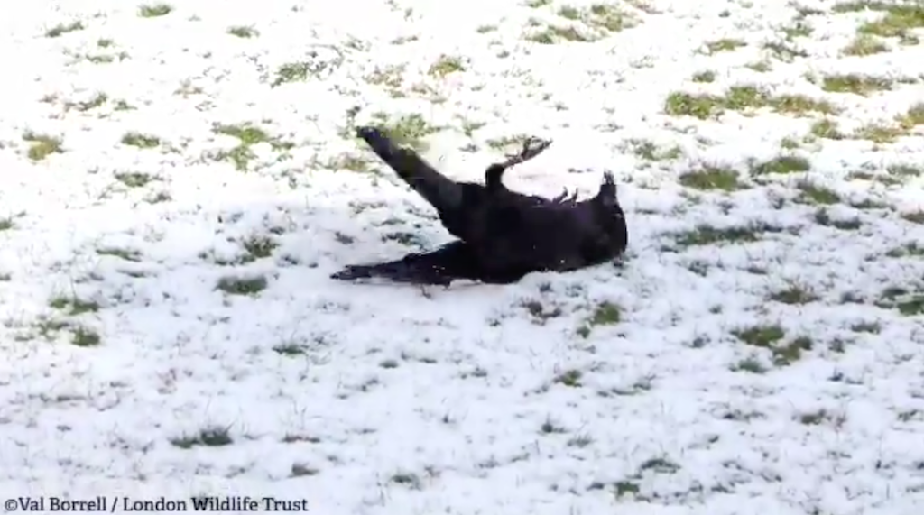 Val Borrell with London Wildlife Trust captured a joyful video of a childlike raven rolling in the snow.