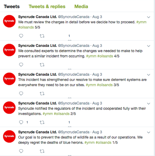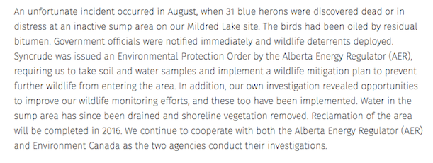 Syncrude acknowledged the deaths in its annual sustainability report.