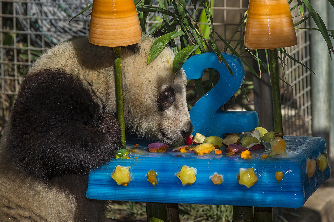 The male panda, whose name means little gift and is pronounced sshyaoww lee woo, enjoyed a four-foot, 100-pound ice cake decorated with some of his preferred foods including slices of apples, carrots and yams on his big day July 29.